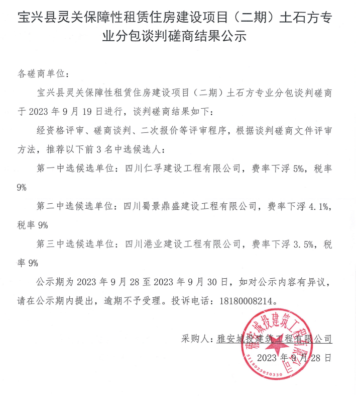 寶興縣靈關保障性租賃住房建設項目(二期)土石方專業(yè)分包談判磋商結(jié)果公示