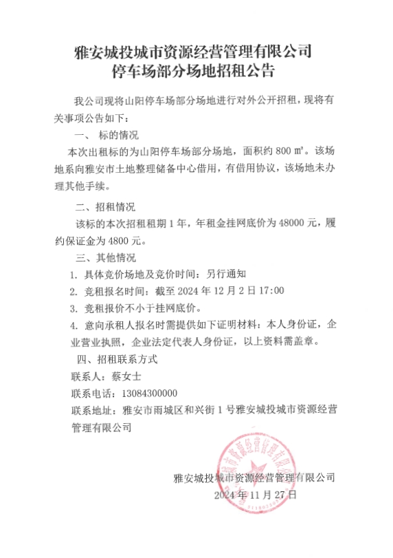 雅安城投城市資源經(jīng)營(yíng)管理有限公司停車場(chǎng)部分場(chǎng)地招租公告