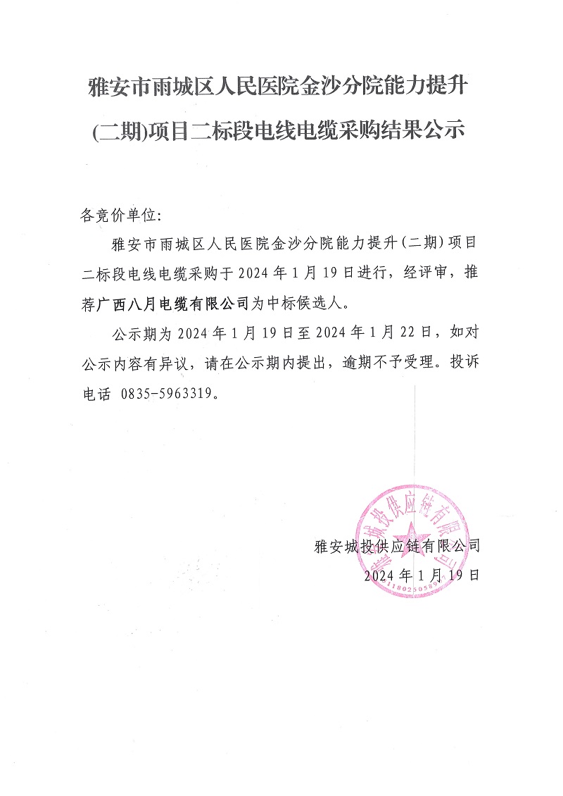 雅安市雨城區(qū)人民醫(yī)院金沙分院能力提升(二期)項(xiàng)目二標(biāo)段電線(xiàn)電纜采購(gòu)結(jié)果公示