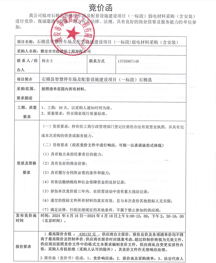 石棉縣智慧停車場及配套設施建設項目(一標段)弱電材料采購(含安裝)競價公告
