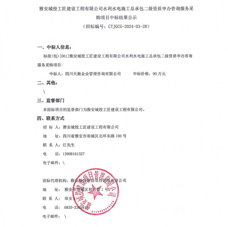 雅安城投工匠建設(shè)工程有限公司水利水電施工總承包二級(jí)資質(zhì)申辦咨詢(xún)服務(wù)采購(gòu)項(xiàng)目中標(biāo)結(jié)果公示