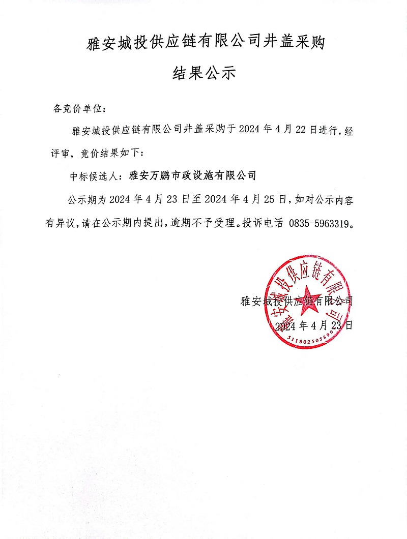雅安城投供應鏈有限公司井蓋采購結果公示