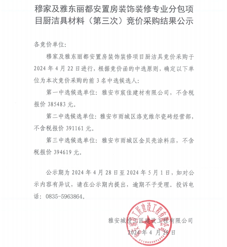穆家及雅東麗都安置房裝飾裝修專業(yè)分包項(xiàng)目潔具材料(第三次)競價采購結(jié)果公示