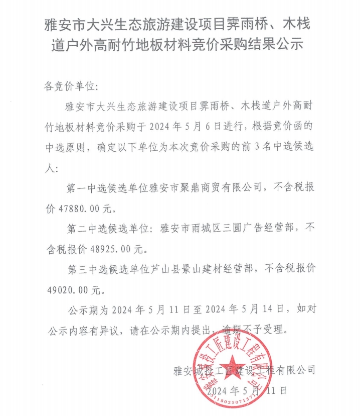雅安市大興生態(tài)旅游建設項目霽雨橋、木棧道戶外高耐竹地板材料競價采購結(jié)果公示