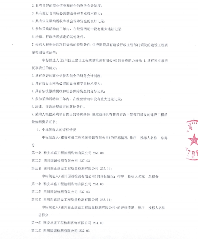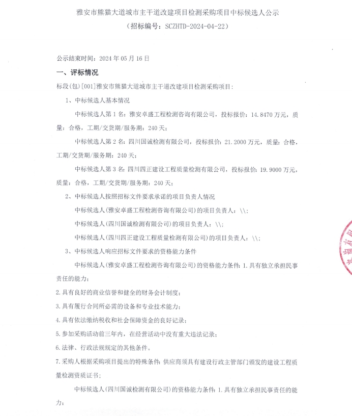 雅安市熊貓大道城市主干道改建項(xiàng)目檢測采購項(xiàng)目中標(biāo)候選人公示