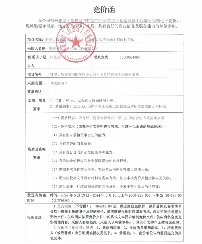 雅安大熊貓博物館接待中心首層大堂精裝修工程輔材采購競價(jià)公告