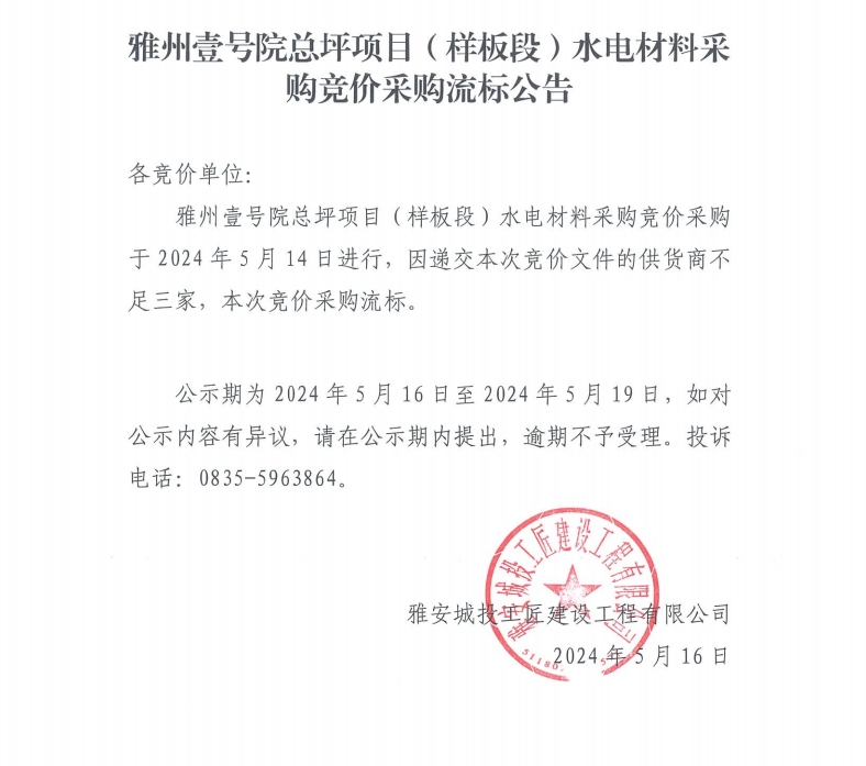 雅州壹號(hào)院總坪項(xiàng)目(樣板段)水電材料采購競(jìng)價(jià)采購流標(biāo)公告