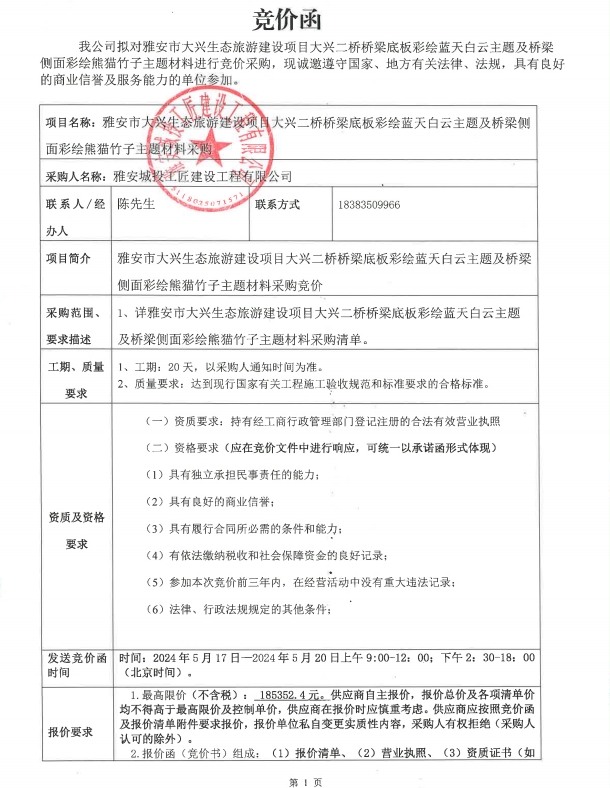 雅安市大興生態(tài)旅游建設項目大興二橋橋梁底板彩繪藍天白云主題及橋梁側面彩繪熊貓竹子主題材料采購競價公告