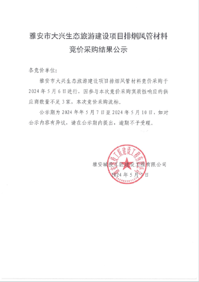 雅安市大興生態(tài)旅游建設項目排煙風管材料競價采購結果公示