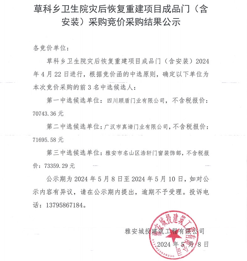 草科鄉(xiāng)衛(wèi)生院災后恢復重建項目成品門(含安裝)采購競價采購結果公示