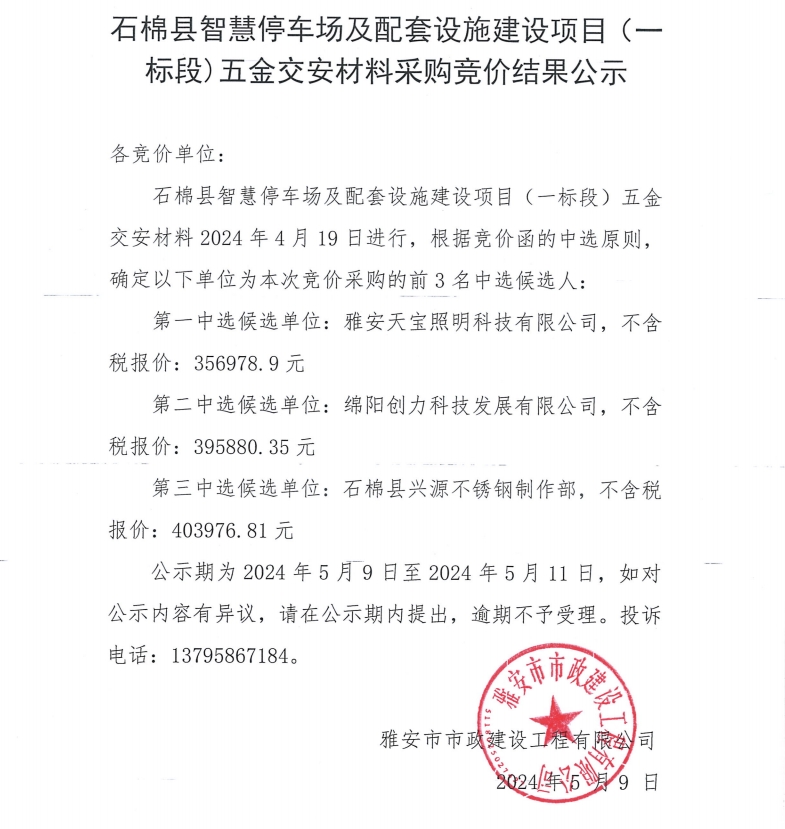 石棉縣智慧停車場及配套設(shè)施建設(shè)項目(一標段)五金交安材料采購競價結(jié)果公示