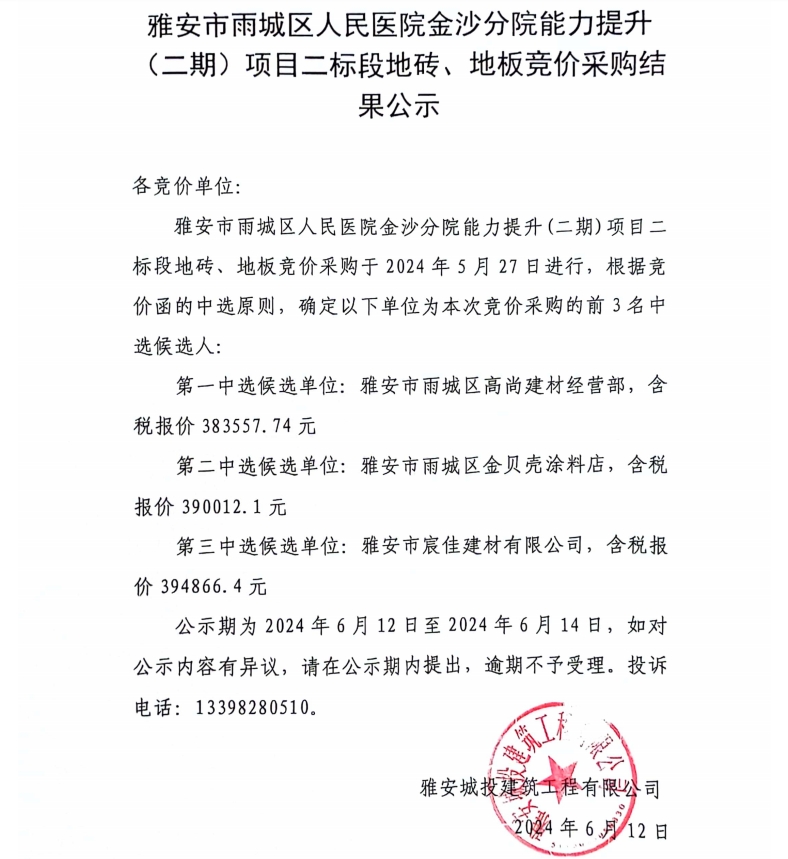 雅安市雨城區(qū)人民醫(yī)院金沙分院能力提升(二期)項目二標段地磚、地板競價采購結(jié)果公示