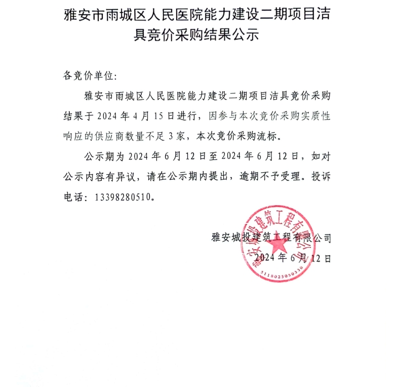 雅安市雨城人民醫(yī)院能力建設(shè)二期項(xiàng)目潔具競價采購結(jié)果公示