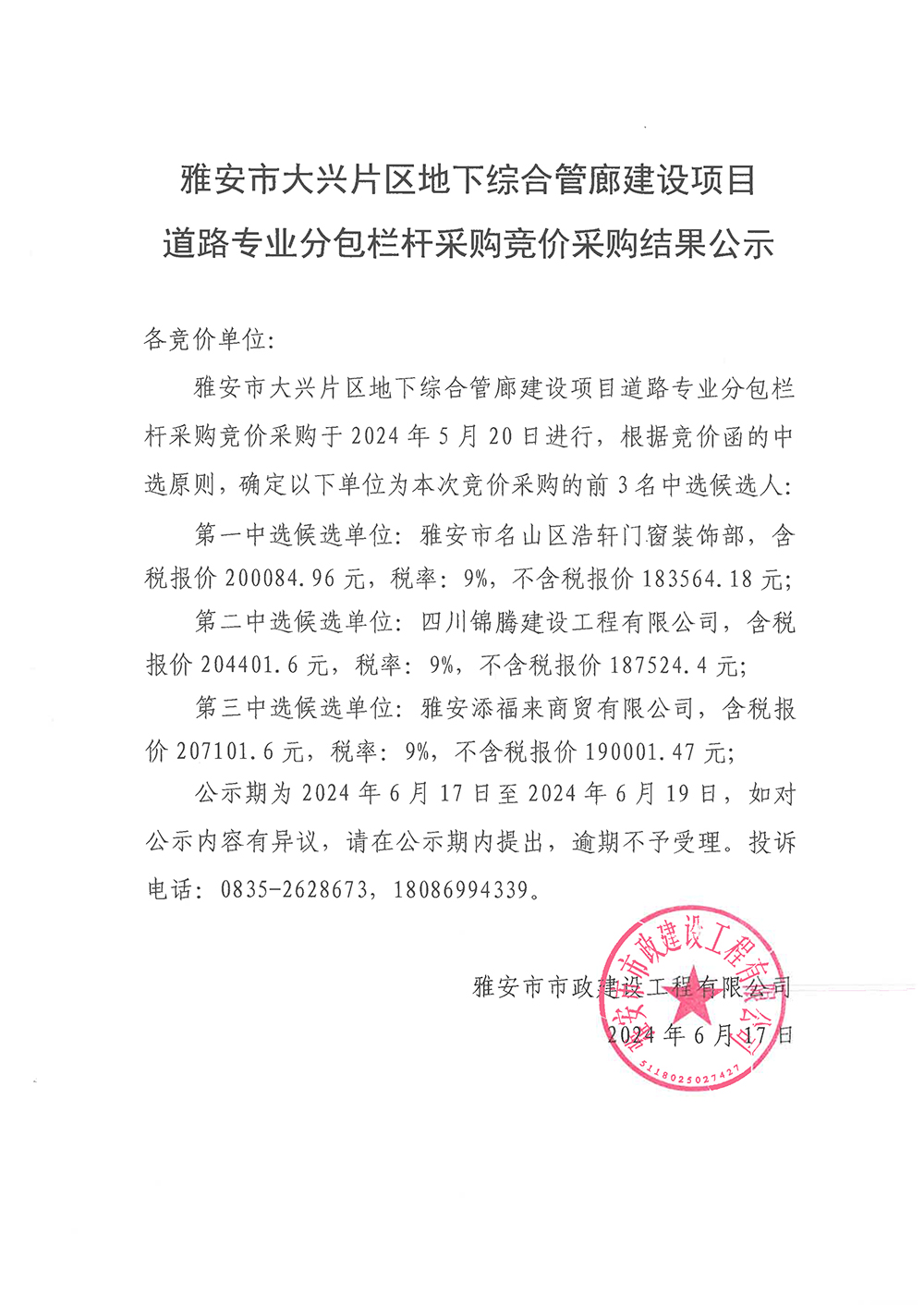 雅安市大興片區(qū)地下綜合管廊建設(shè)項(xiàng)目道路專業(yè)分包欄桿采購(gòu)競(jìng)價(jià)采購(gòu)結(jié)果公示