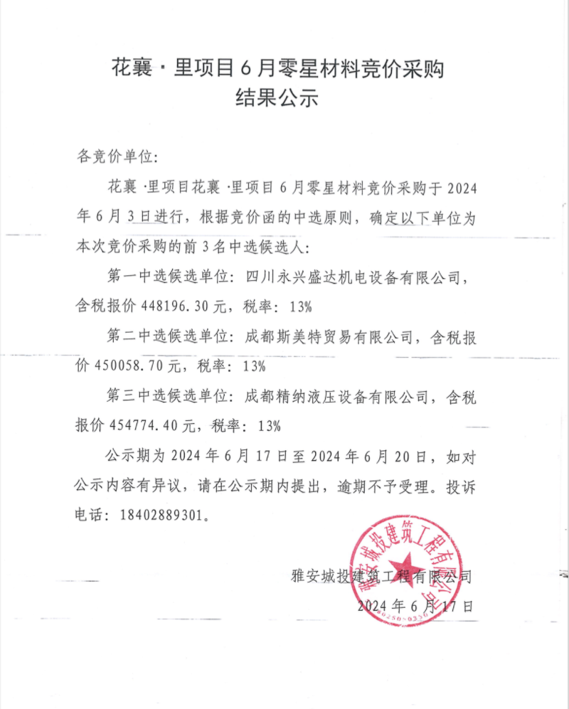 花襄·里項(xiàng)目6月零星材料競價(jià)采購結(jié)果公示