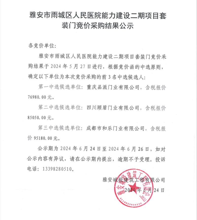 雅安市雨城區(qū)人民醫(yī)院能力建設(shè)二期項目套裝門競價采購結(jié)果公示