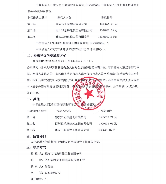 雨城區(qū)中心城區(qū)城市內(nèi)澇整治項目(一標段)勞務(wù)分包服務(wù)項目中標候選人公示