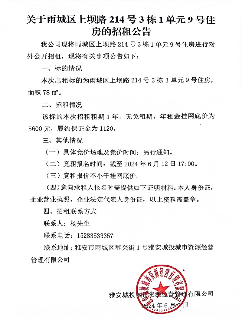 關(guān)于雨城區(qū)上壩路214號3棟1單元9號住房的招租公告