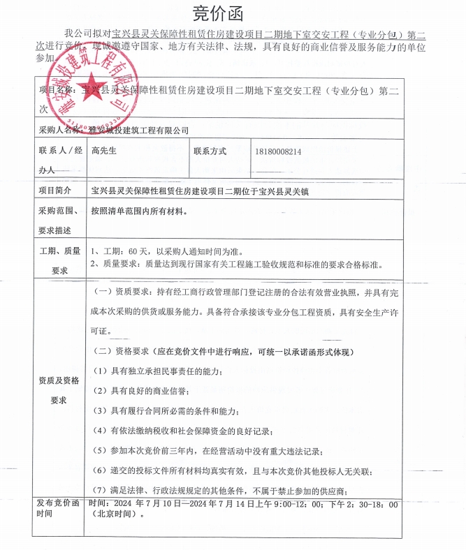寶興縣靈關保障性租賃住房建設項目二期地下室交安工程(專業(yè)分包)第二次競價公告