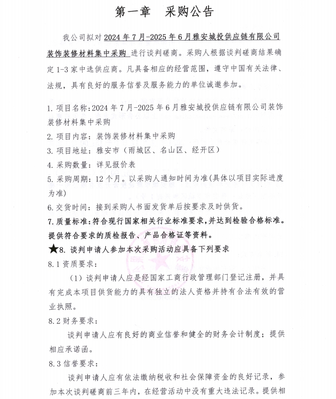 2024年7月-2025年6月雅安城投供應(yīng)鏈有限公司裝飾裝修材料集中采購公告
