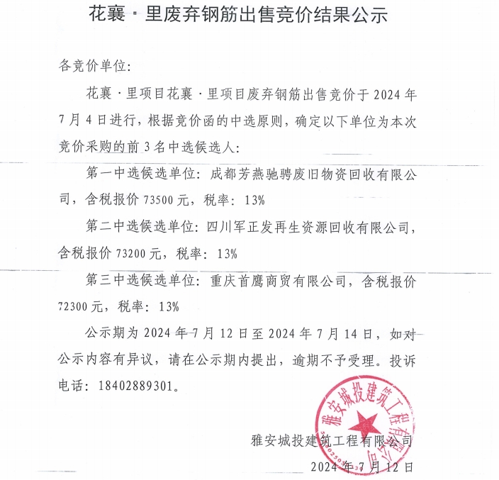 花襄·里廢棄鋼筋出售競價結(jié)果公示