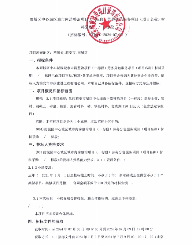 雅安市城區(qū)中心城市內(nèi)澇整治項(xiàng)目(一標(biāo)段)勞務(wù)分包服務(wù)項(xiàng)目(項(xiàng)目名稱)材料采購(gòu)招標(biāo)公告