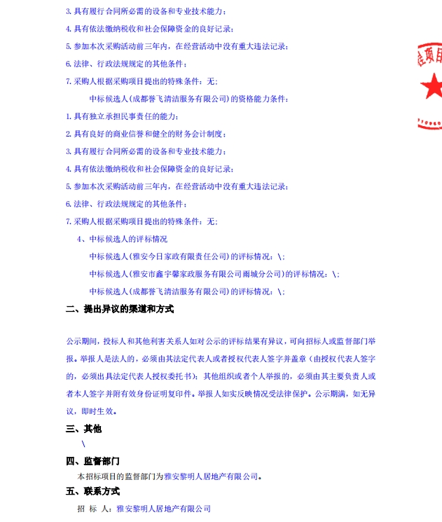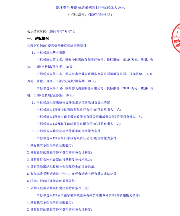 蒙頂壹號(hào)開(kāi)荒保潔采購(gòu)項(xiàng)目中標(biāo)候選人公示