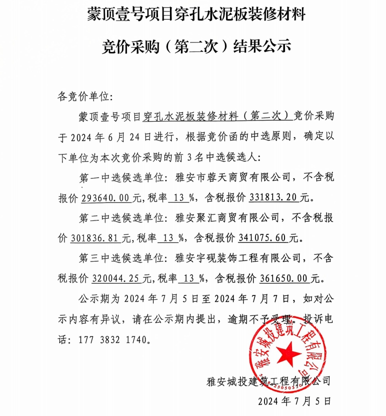 蒙頂壹號項(xiàng)目穿孔水泥板裝修材料競價采購(第二次)結(jié)果公示