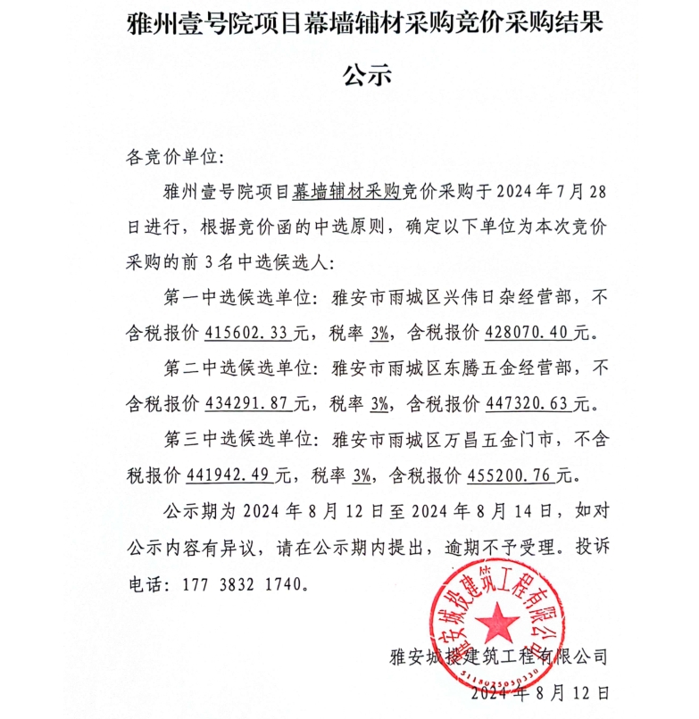 雅州壹號(hào)院項(xiàng)目幕墻輔材采購競(jìng)價(jià)采購結(jié)果公示