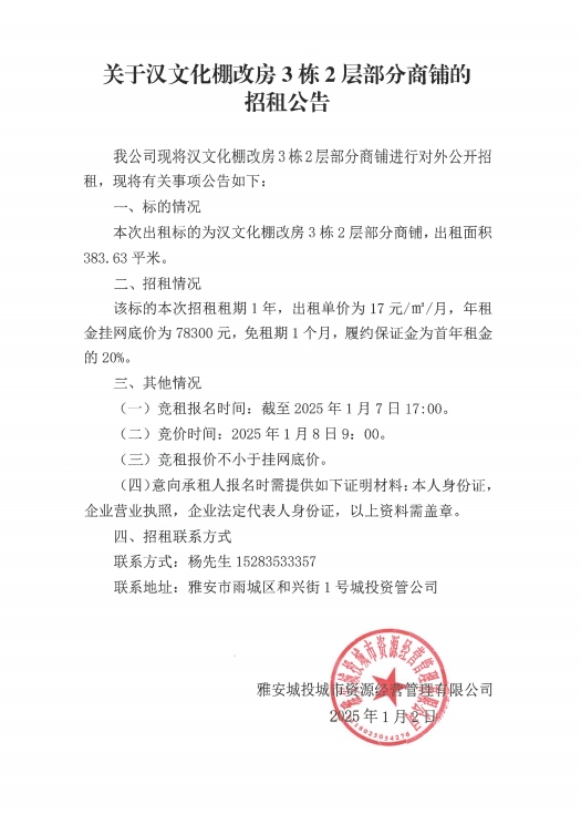 關(guān)于漢文化棚改房3棟2層部分商鋪的招租公告