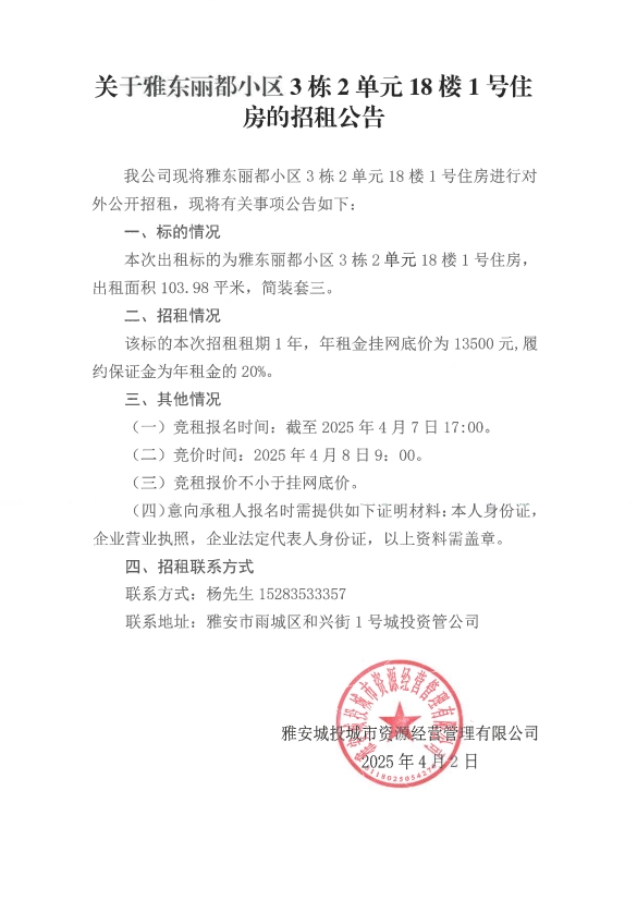 關(guān)于雅東麗都小區(qū)3棟2單元18樓1號住房的招租公告