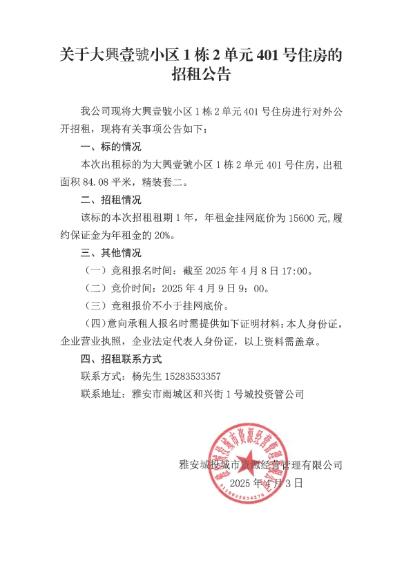 關(guān)于大興壹號(hào)小區(qū)1棟2單元401號(hào)住房的招租公告