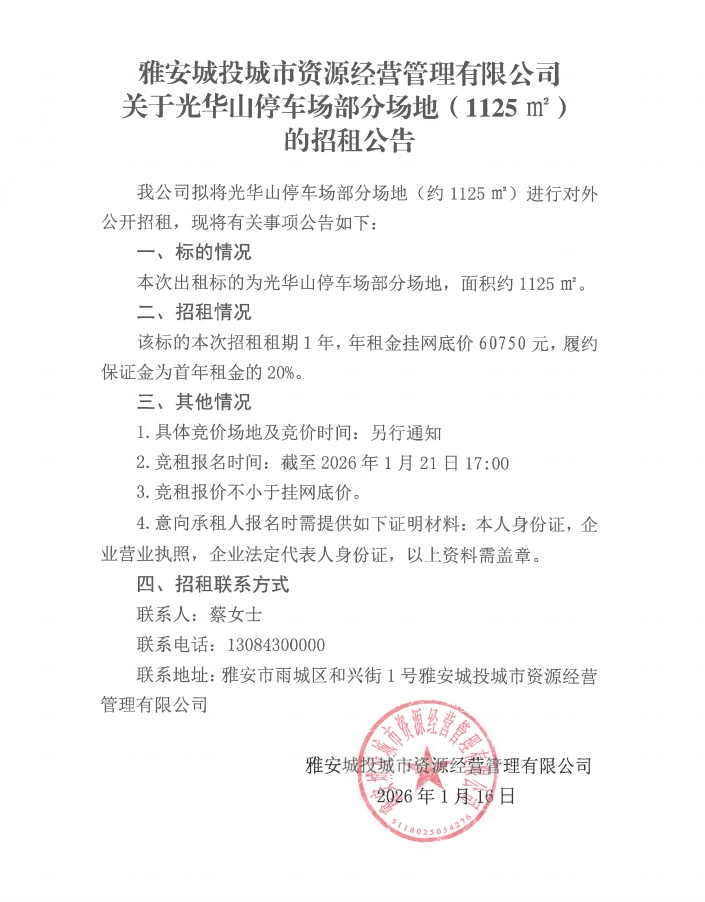 雅安城投城市資源經(jīng)營(yíng)管理有限公司關(guān)于光華山停車(chē)場(chǎng)部分場(chǎng)地(1125㎡)的招租公告