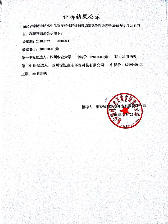 滎經(jīng)羅家灣電站水生生物多樣性評價報告編制競爭性談判評標(biāo)結(jié)果公示