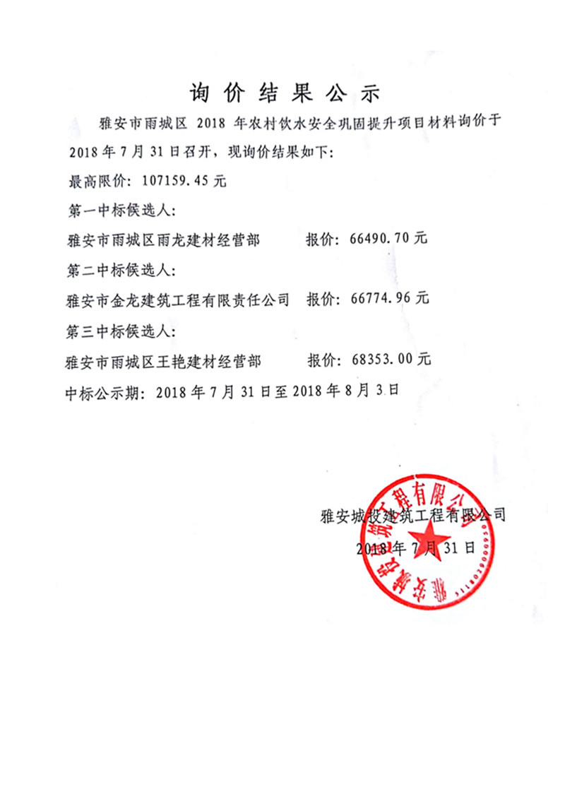 雅安市雨城區(qū)2018年農村飲水安全鞏固提升項目材料詢價結果公示