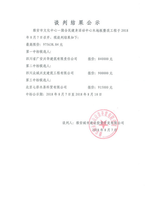 雅安市文化中心一期全民健身活動(dòng)中心木地板整改工程競爭性談判結(jié)果公示