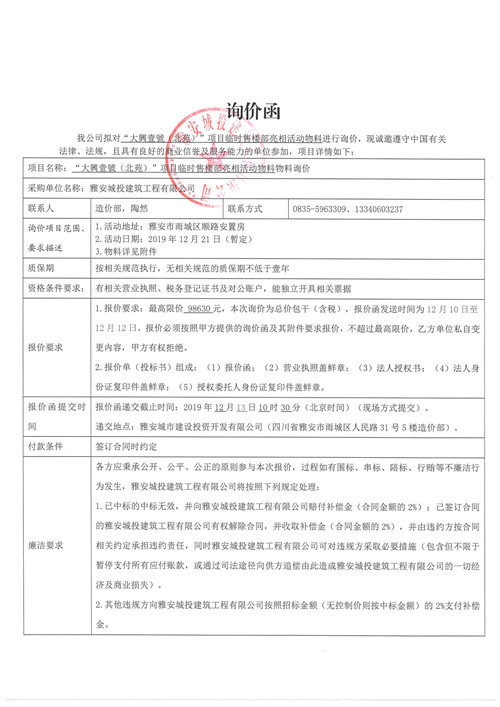 大興壹號(北苑)項目臨時售樓部亮相活動物料詢價函