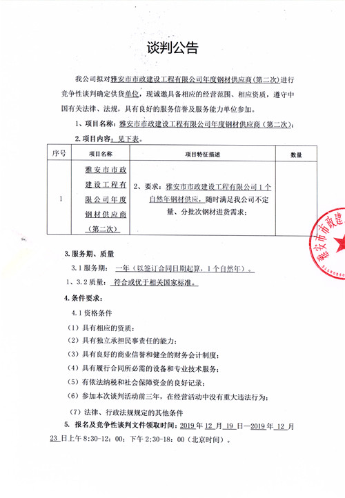 雅安市市政建設(shè)工程有限公司年度鋼材供應(yīng)商競爭性談判公告(第二次)