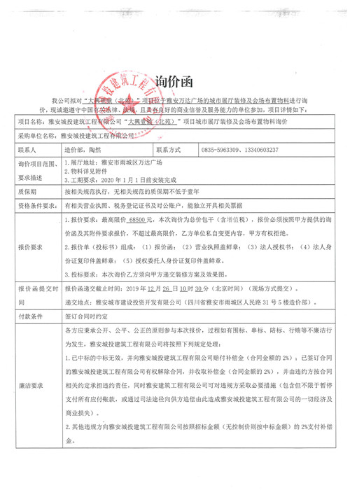 大興壹號(hào)(北苑)項(xiàng)目位于雅安萬(wàn)達(dá)廣場(chǎng)的城市展廳裝修及灰塵布置物料詢價(jià)函