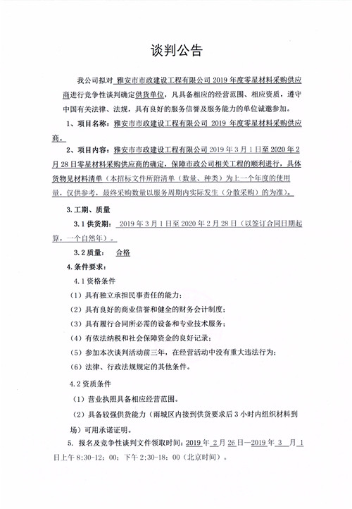 雅安市市政建設工程有限公司2019年度零星材料采購供應商競爭性談判公告