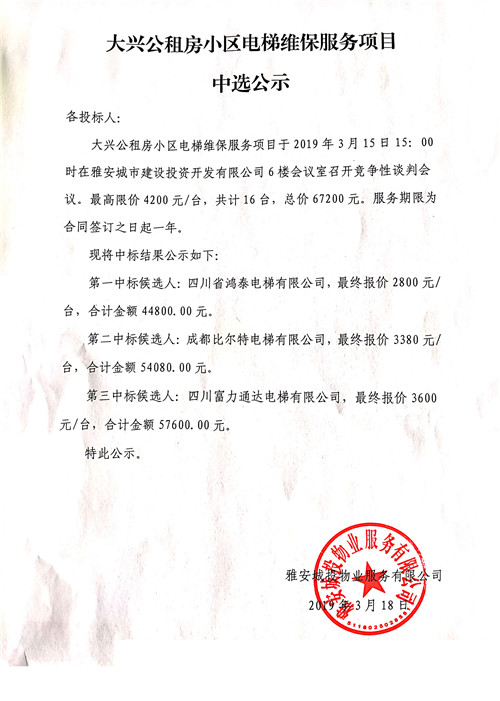 大興公租房小區(qū)電梯維護服務(wù)項目中選公示