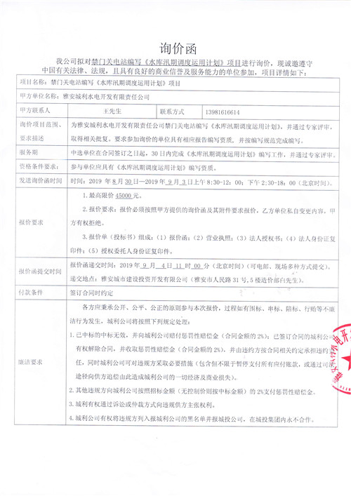 雅安城利水電開發(fā)有限責(zé)任公司禁門關(guān)電站編寫《水庫汛期調(diào)度運(yùn)用計(jì)劃》項(xiàng)目競爭性談判公告