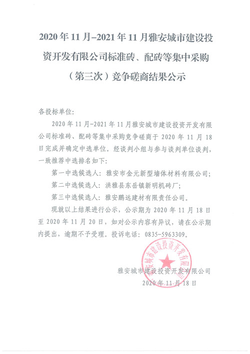 2020年11月-2021年11月雅安城市建設投資開發(fā)有限公司標準磚、配磚等集中采購(第三次)競爭磋商結果公示