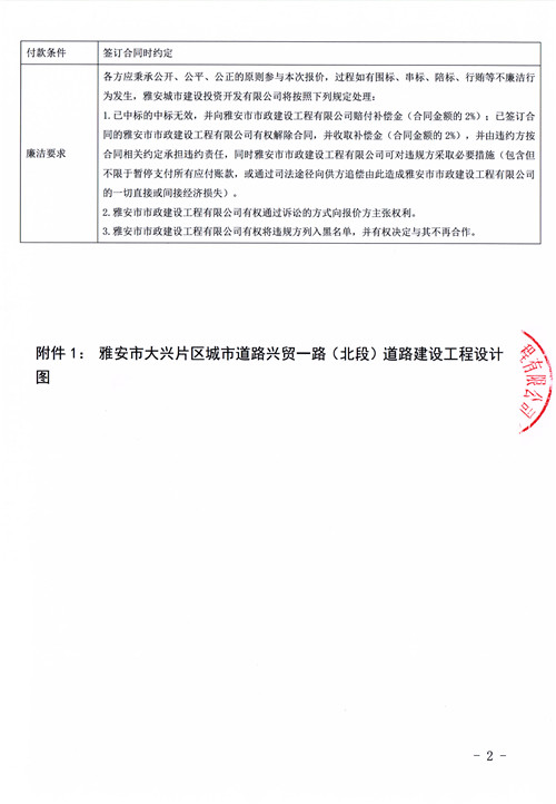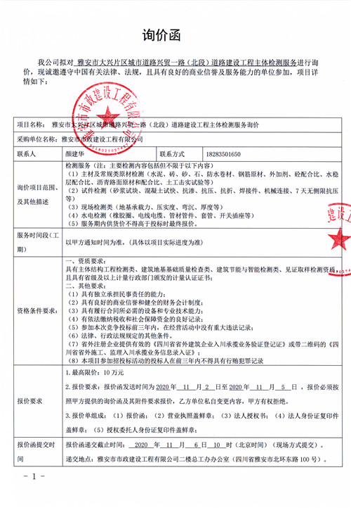 雅安市大興片區(qū)城市道路興貿(mào)一路(北段)道路建設工程主體檢測服務詢價函