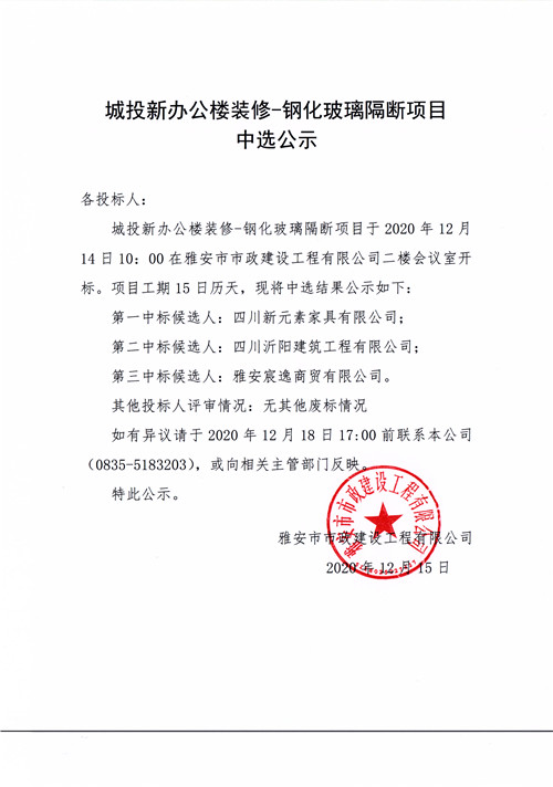 城投新辦公樓裝修-鋼化玻璃隔斷項目中選公示