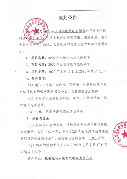 2020年土地溝電站電能銷售競(jìng)爭(zhēng)性談判公告