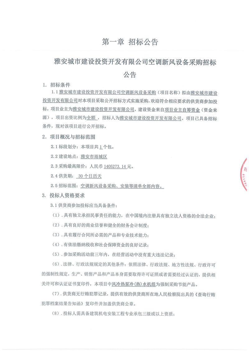 雅安城市建設(shè)投資開發(fā)有限公司空調(diào)新風(fēng)設(shè)備采購招標公告