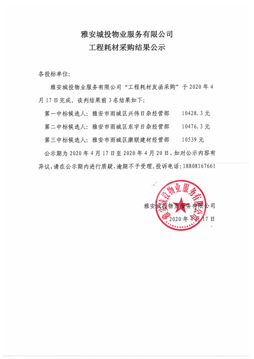 城投物業(yè)公司工程耗材采購結果公示