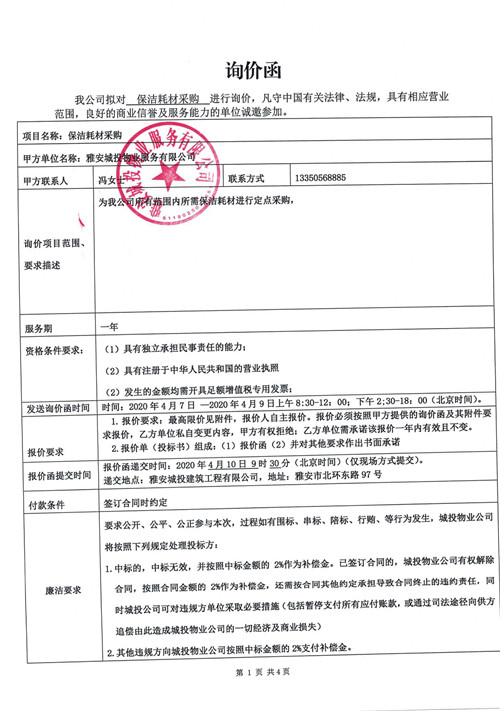 城投物業(yè)公司保潔耗材采購詢價函