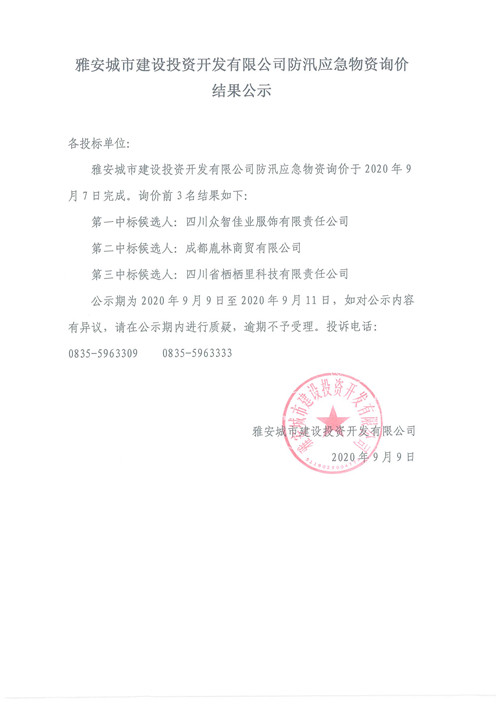 雅安城市建設(shè)投資開發(fā)有限公司防汛應(yīng)急物資詢價結(jié)果公示